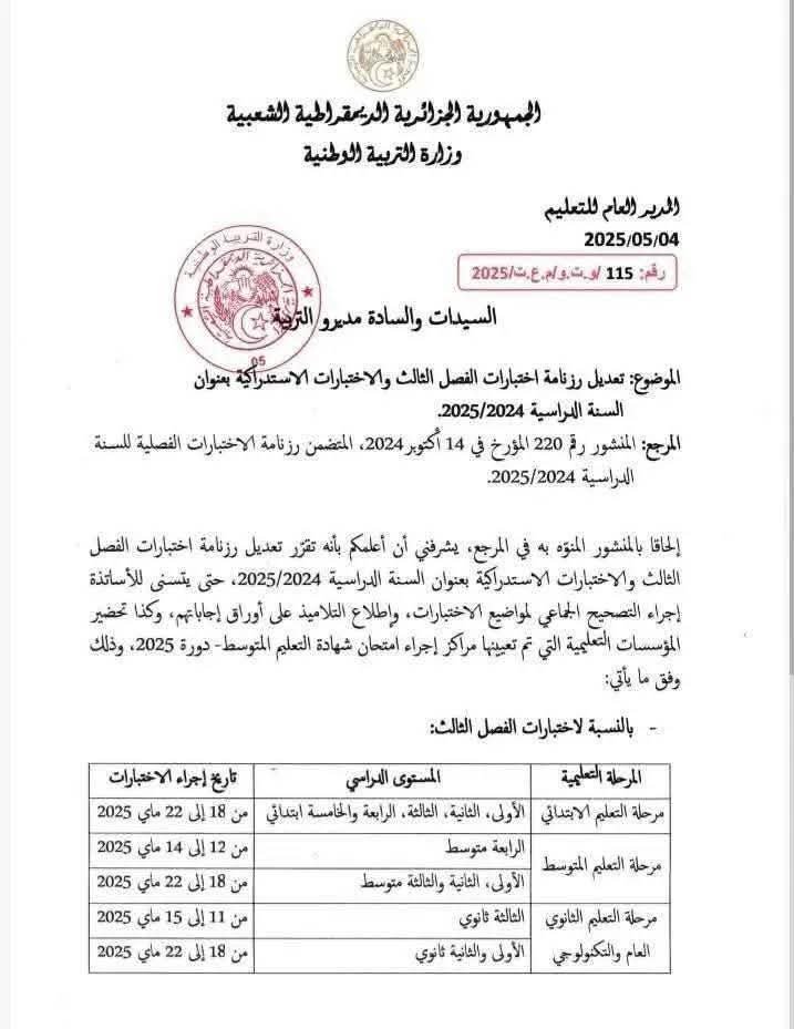 Ainsi, ces modifications, souligne le document du département de Mohamed Seghir Saâoudi, ont pour objectif de permettre aux enseignants de se consacrer pleinement à la correction des examens de fin d’année.