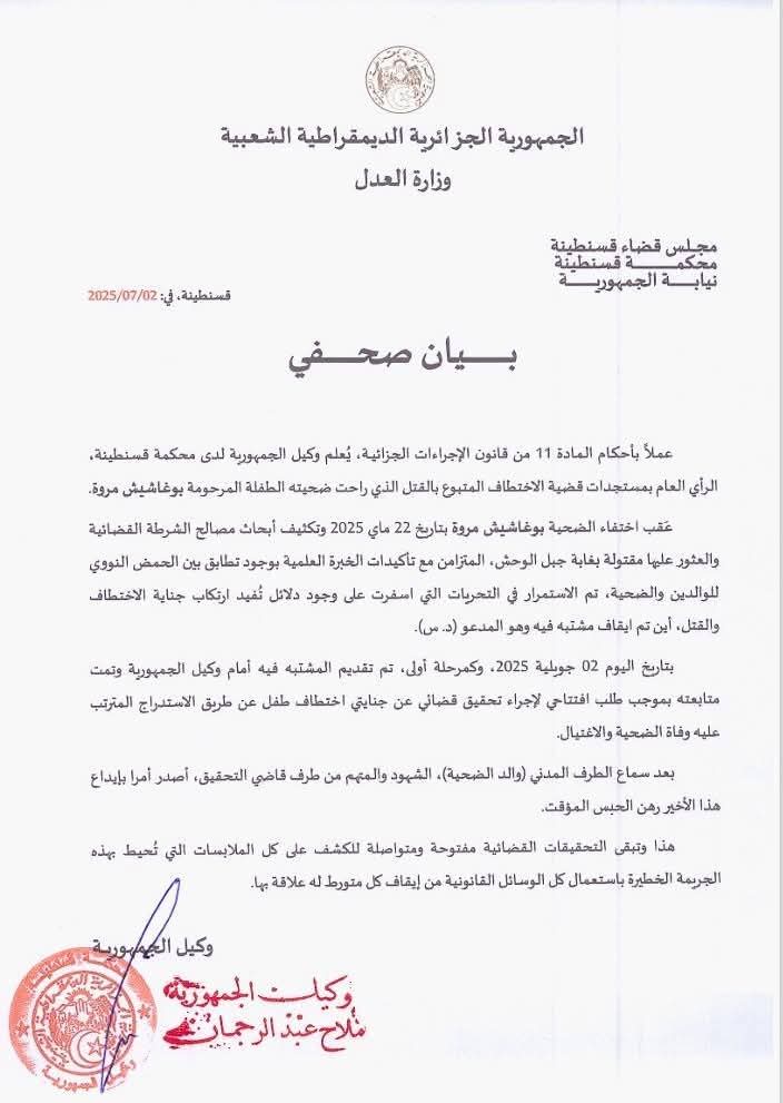 Le Parquet de Constantine a annoncé, ce mercredi 2 juillet 2025, l’arrestation d’un suspect dans le sordide dossier du meurtre de Marwa Bougachiche, une fillette de 13 ans, enlevée le 22 mai dernier.