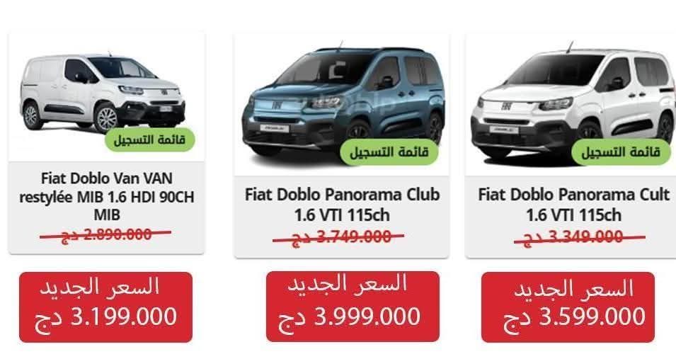 ● Fiat Doblo Panorama Cult 1.6 VTI 115ch : passe de 3.349.000 DZD (334,9 millions de centimes) à 3.599.000 DZD (359,9 millions de centimes).