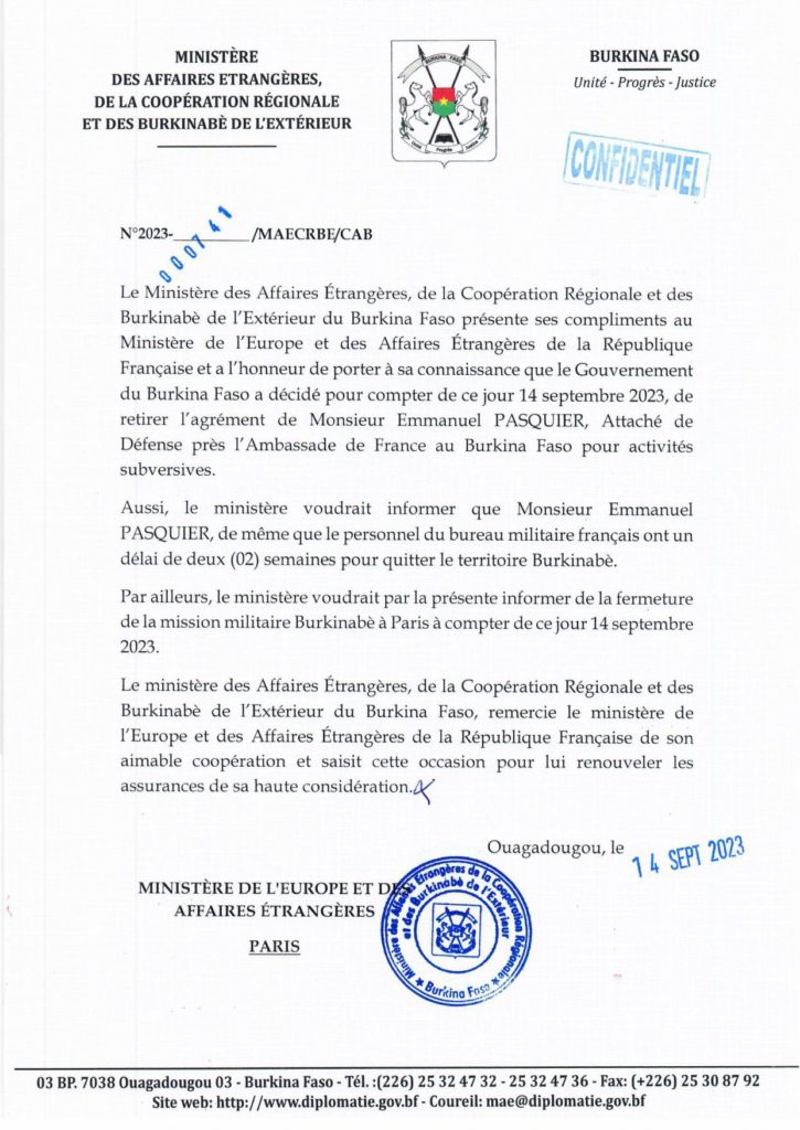 « Le gouvernement du Burkina Faso a décidé (…) de retirer l’agrément de M. Emmanuel Pasquier, attaché de défense près l’ambassade de France au Burkina Faso pour activités subversives», précise la missive adressée au ministère des Armées français.