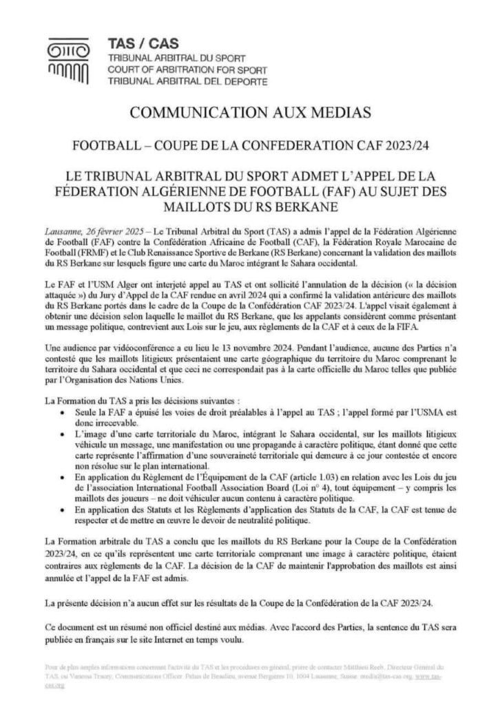 Ainsi, le TAS annule le précédent jugement de la confédération africaine de football (CAF) qui autorisait le maillot du club Marocain, arborant un symbole politique en violation des règlements. La direction de l’USMA dans son communiqué confirme la décision du TAS en sa faveur : «La Cour d’Arbitrage du Sport (TAS) a rendu son verdict final dans l’affaire du match opposant l’USM Alger à la RS Berkane, déclarant notre club vainqueur du litige. Cette décision confirme la légitimité de notre position juridique et réaffirme notre engagement à défendre les droits de l’équipe conformément aux lois et règlements en vigueur ».