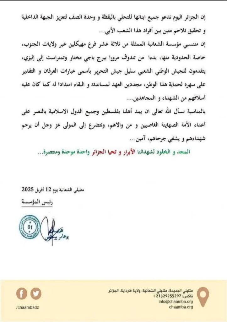 Par ailleurs, active dans plusieurs wilayas du Sud, la Fondation Chaanba réitère son soutien indéfectible à l’Armée Nationale Populaire (ANP), saluant sa réactivité et son professionnalisme dans la gestion des menaces sécuritaires.