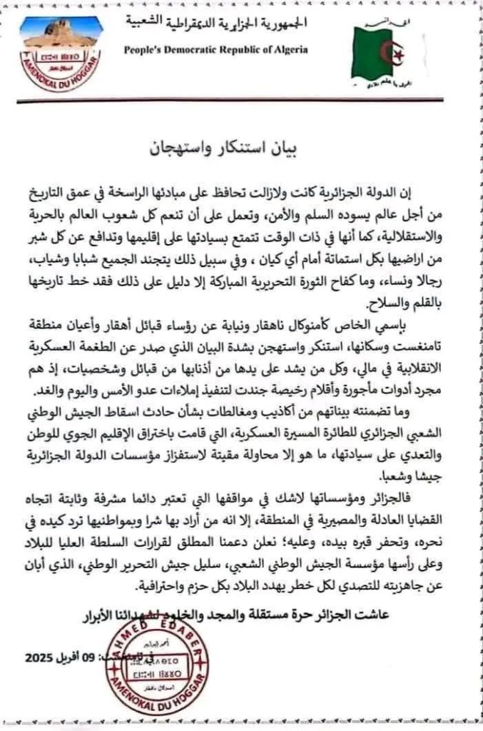 Soutenu par les notables de Tamanrasset, il condamne fermement les dérives du régime malien et réaffirme son attachement à l’Algérie, à son armée et à la stabilité régionale.