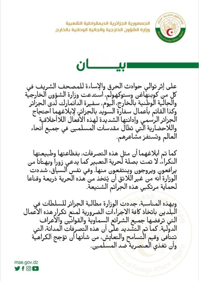 « Face à la multiplication des actes d’autodafé du Saint Coran à Copenhague et à Stockholm, le ministère des Affaires étrangères a annoncé la convocation de l’ambassadrice du Danemark en Algérie et du chargé d’affaires auprès de l’ambassade du Suède à Alger pour transmettre les protestations et les condamnations de l’Algérie contre ces actes immoraux qui portes atteintes à la religion musulmane et provoquent les musulmans à travers le monde » mentionne le communiqué du ministère des Affaires étrangères.