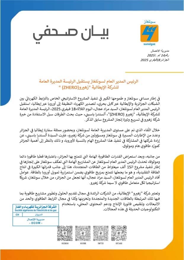 En et selon le communiqué du groupe Sonelgaz, le PDG de ce dernier, M. Mourad Adjal, s’est entretenu ce mardi 18 février 2025, avec Mme Alessandra Bassini, la PDG du groupe «Zhero», dans le but de sceller un partenariat entre les deux groupes, dans le cadre du méga projet d’interconnexion électrique entre les réseaux électriques algérien et italien à travers la réalisation d’un câble sous-marin.