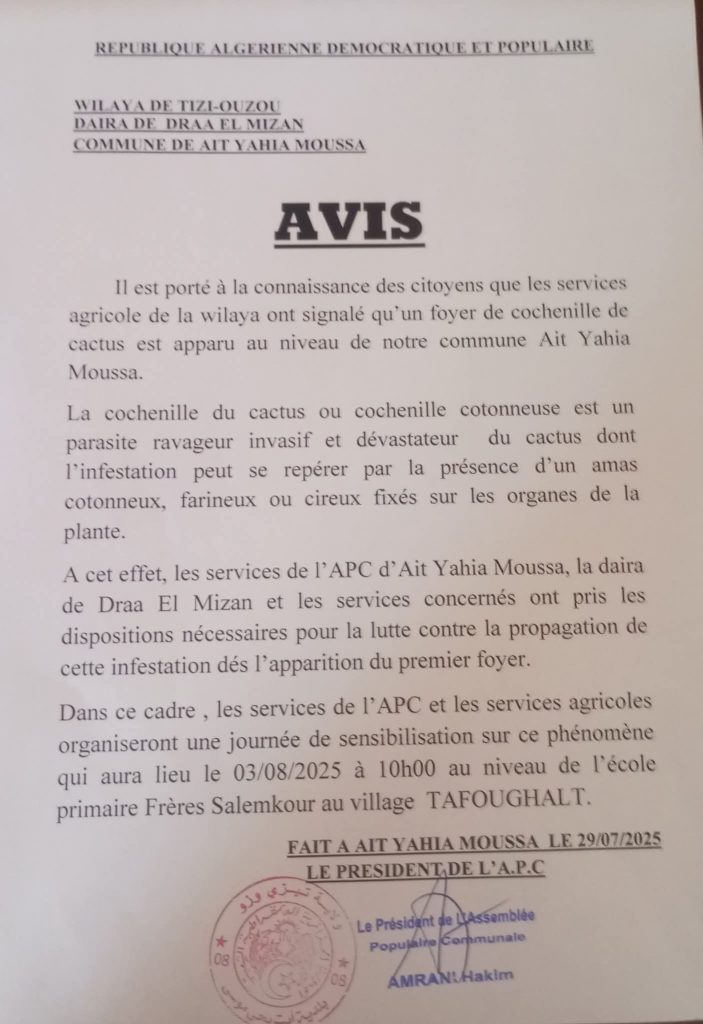 En Kabylie et dans plusieurs régions de l’ Algérie profonde, le cactus demeure une plante du patrimoine arboricole. Selon un avis émanant de l’ APC d’ Ait Yahia Moussa, la cochenille de cactus ou cochenille cotonneux est un parasite ravageur invasif et dévastateur du cactus dont l’infestation peut se repérer par la présence d’un amas cotonneux faramineux ou cireux sur les organes de la plante. C’est la seule indication donnée dans ce document sans citer si ce parasite pourrait par exemple contaminer le fruit.