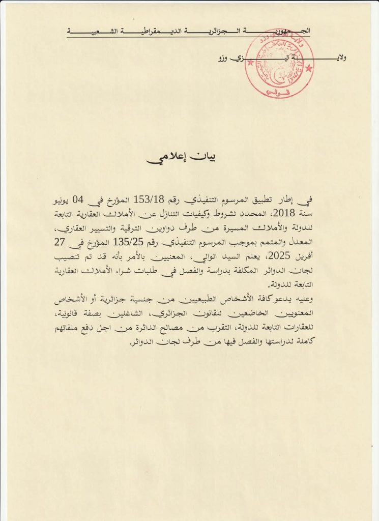 En effet, le document dont JUST-INFODZ détient une copie, précise que dans le cadre de l’application du décret exécutif n°18/153 du 04 juin 2018 relatif à la cession des biens immobiliers de l’ État gérés par l’OPGI revu et complété par le décret exécutif n°25/135 du 27 avril 2025 définissant les conditions et les mécanismes de l’achat de ces biens, les concernés sont informés que les commissions de dairas sont installées.