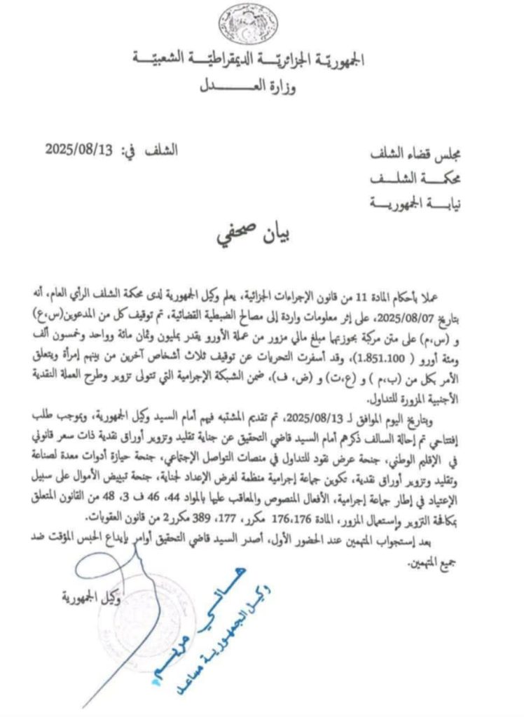 C’est du moins ce qu’indique le Parquet de la wilaya de Chlef, dans un communiqué rendu public ce mercredi 13 août 2025. La même source précise que les membres dudit réseau, au nombre de cinq, ont été mis sous mandat de dépôt.