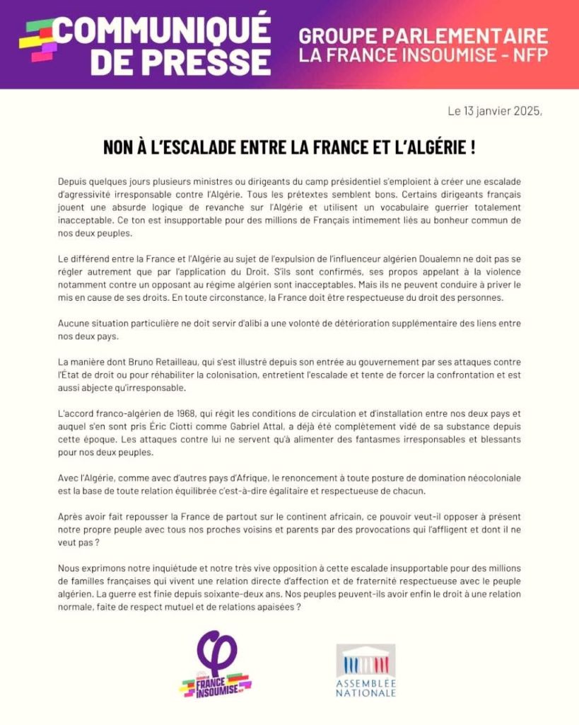 C’est le cas du groupe parlementaire de La France insoumise NFP (Nouveau front populaire), qui vient de clarifier sa position dans un communiqué de presse diffusé le 13 janvier titré » Non à l’escalade entre la France et l’Algérie ».