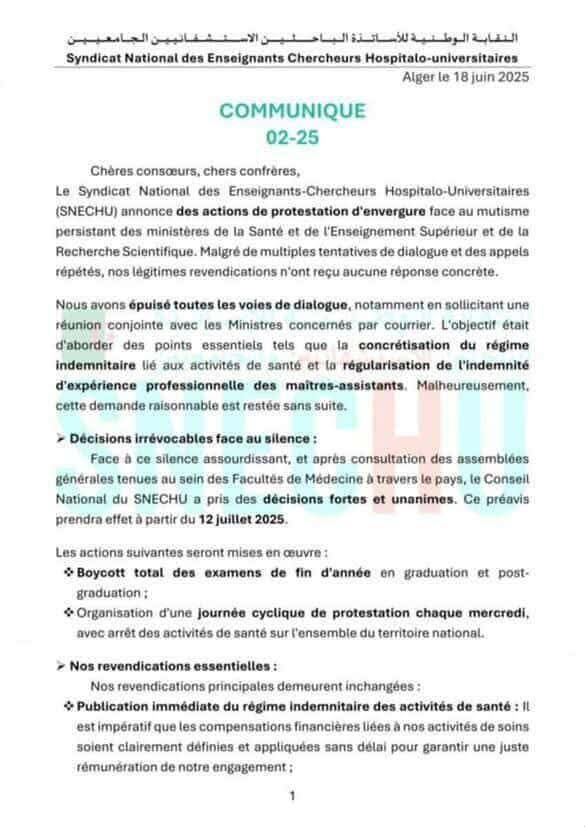 Ainsi, le Syndicat National des Enseignants-Chercheurs Hospitalo-Universitaires (SNECHU) a annoncé, ce mercredi, un mouvement de protestation d’envergure en réponse au « mutisme persistant » des ministères de la Santé et de l’Enseignement Supérieur.