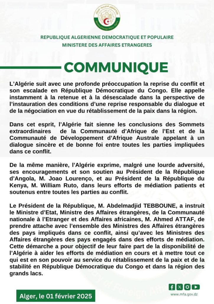Dans cette optique, le communiqué ajoute que « l’Algérie fait sienne les conclusions des Sommets extraordinaires de la Communauté d’Afrique de l’Est et de la Communauté de Développement d’Afrique Australe appelant à un dialogue sincère et de bonne foi entre toutes les parties impliquées dans ce conflit. ».