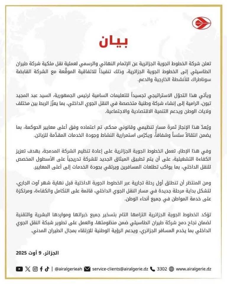 Ainsi, ce samedi 9 août 2025, la compagnie mère Air Algérie, a annoncé la finalisation du processus du transfert de propriété de la compagnie Tassili Airlines à son profit, et par conséquent le lancement du « compte à rebours » du lancement effectif de la nouvelle compagnie aérienne.