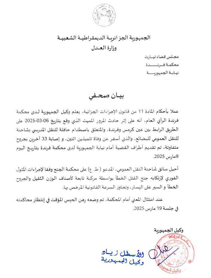 Ainsi, ce lundi 10 mars 2025, la Cour de justice de la wilaya de Tiaret a annoncé dans un communiqué, que le chauffeur du camion semi-remorque ayant percuté le bus scolaire, a été déféré devant le tribunal correctionnel selon la procédure de comparution immédiate au tribunal de Frenda.