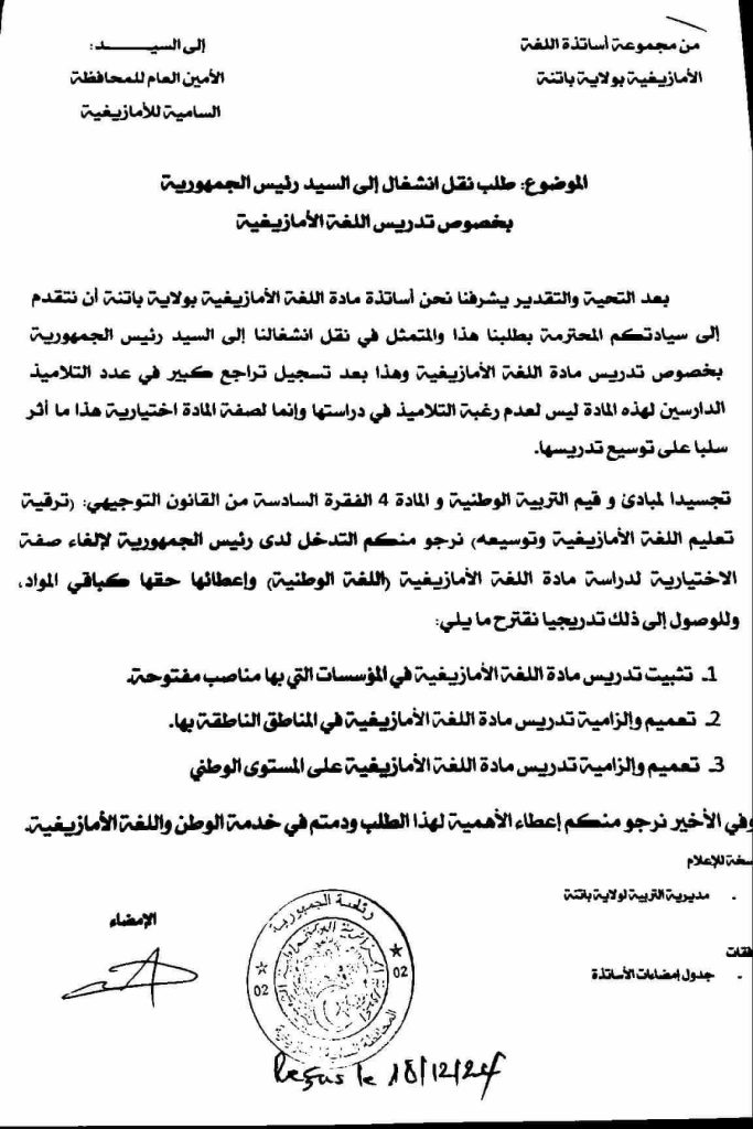 En effet et à chaque rentrée scolaire, la question de sa généralisation notamment dans le système éducatif se pose avec acuité chez les enseignants de Tamazight. Ceux de la wilaya de Batna rappellent cette revendication au secrétaire général du Haut commissariat à l’ Amazighité, M. El Hachemi Assad, dont l’institution est directement rattachée à la Présidence de la République, pour le solliciter à soulever leurs revendications auprès du président de la république, M. Abdelmajid Tebboune. Dans cet écrit, ils ont relevé que cette langue officielle et nationale est toujours facultive. Ils ont dénoncé ce caractère car, estiment-ils, cette langue est l’une des composantes de l’identité nationale aux côtés de l’Arabité et de l’ Islamité.