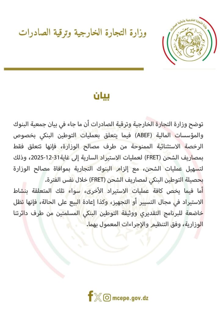 Le document du ministère du Commerce extérieur, note également que cette mesure vise à «faciliter les opérations d’expédition», et de ce fait, les banques commerciales «sont tenues» de fournir au ministère un rapport sur la domiciliation bancaire des frais de transport (FRET) durant cette même période.