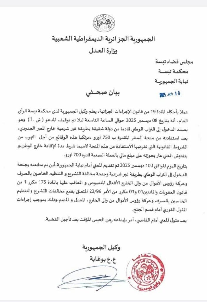 En effet et selon le communiqué rendu public ce mercredi par le parquet de la République près le tribunal de Tébessa, les faits se sont déroulés dans la soirée du 8 décembre 2025, aux alentours de 21 heures.