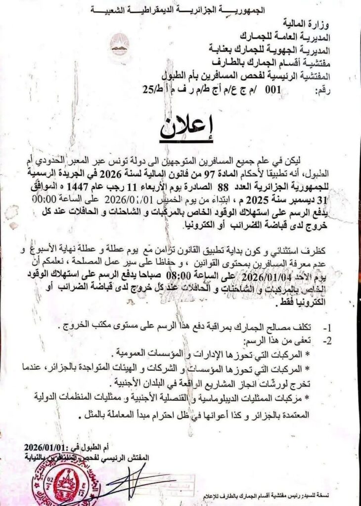 En effet, selon le communiqué des Douanes, cette mesure s’inscrit dans le cadre de l’application des dispositions de l’article 97 de la loi de finances pour l’année 2026, telles que publiées au Journal officiel de la République algérienne (n°88) du 31 décembre 2025. Dans le détail, ce droit devra être acquitté à chaque sortie du territoire, soit auprès des recettes des impôts, soit par paiement électronique, conformément aux mécanismes mis en place par l’administration fiscale.