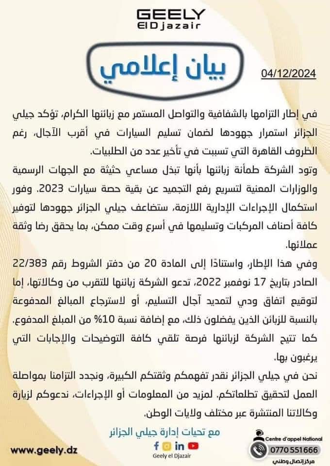 Les responsables de cette marque automobile asiatique rassurent leur clientèle qu’ils fournissent des efforts considérables avec les parties et les ministères concernés en vue de dégeler l’importation du reste du quota de 2023 et ce juste après l’accomplissement de toutes les démarches administratives nécessaires. » Geely Algérie va redoubler d’efforts en garantissant l’arrivée de toutes ses marques le plus vite possible. Ce qui consolidera sa confiance avec ses clients », souligne le document.