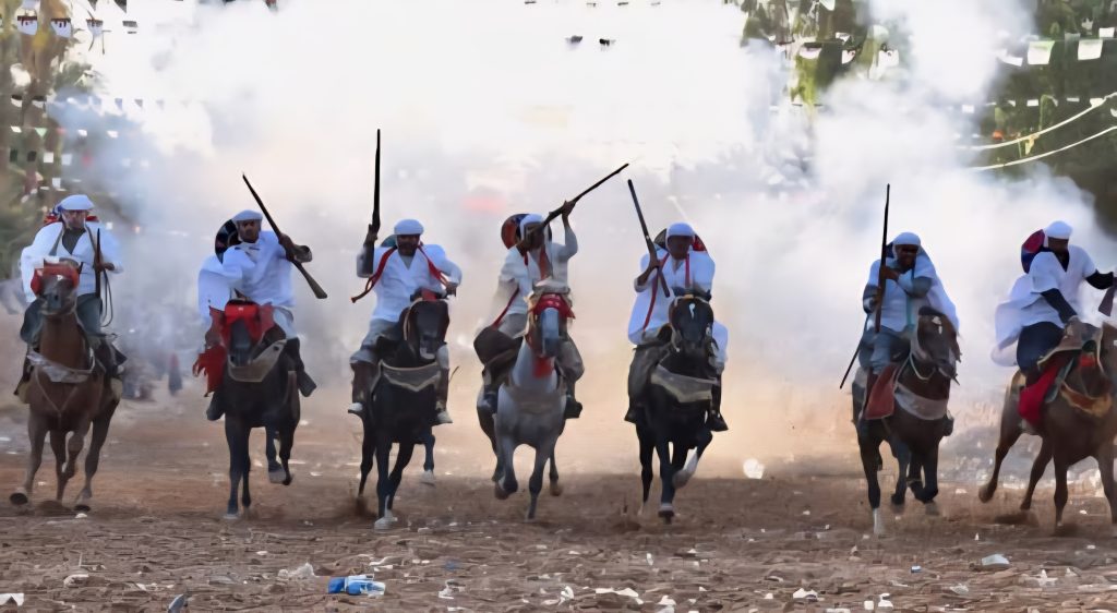 Spectaculaires, elles sont accompagnées de détonations de baroud, exécutées par des cavaliers en superbes tenues traditionnelles qui font tournoyer leur fusil en plein galop avant de le décharger, créant une harmonie parfaite entre le cavalier et sa monture. Étroitement liée à la vie sociale et culturelle de la région de Metlili, berceau de la grande tribu des Châambas, la fantasia constitue un élément authentique du patrimoine culturel populaire dont les racines remontent à des siècles. « Dans la mémoire populaire et en tant que tradition millénaire, elle est indéniablement considérée comme une partie intégrante de notre histoire et de notre culture. Elle symbolise l’héroïsme et le courage de l’homme qui à travers ses montures démontre qu’il reste viscéralement attaché à sa terre et à son identité » affirme un des organisateurs de cette manifestation culturelle qui ajoute « pour toutes ces raisons historiques, nous avons le devoir d’assurer sa transmission aux générations futures ».