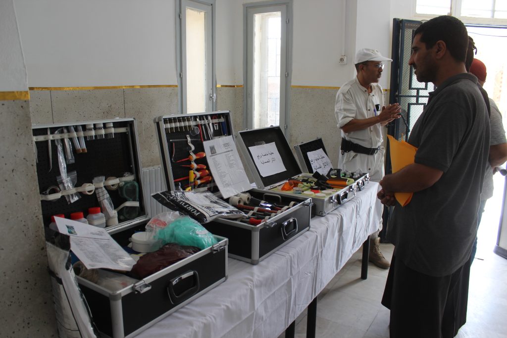 On apprend, donc, que les moyens techniques exposés consistent en des kits à utilisation rapide accompagnant à chaque déplacement les éléments de la police judiciaire. Ils relèvent, selon l’orateur, de deux départements de la police judiciaire, le premier étant chargé de tout ce qui relève de la balistique, de la pyrotechnie (les bombes), à la graphologie et tout ce qui touche à la falsification de documents, mais aussi de la monnaie nationale ou étrangère.
