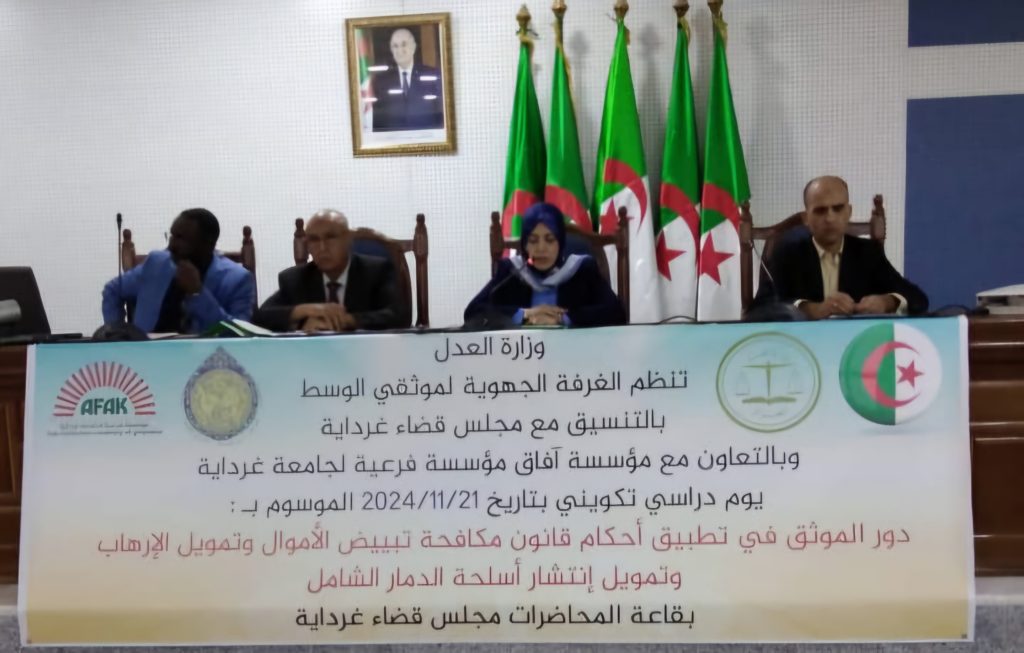 Une Journée d’études sur le rôle du notaire dans l’exécution des décisions judiciaires d’application de la loi n° 23-01 du 7 février 2023, modifiant et complétant la loi n° 05-01du 6 février 2005, relative à la prévention et à la lutte contre le blanchiment d’argent et le financement du terrorisme, a été organisée, hier, jeudi 21 novembre 2024, par la Cour de Justice de Ghardaïa.
