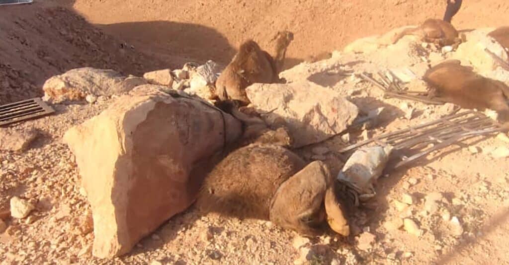 Ils étaient deux dans la cabine, qui du fait du violent impact avec le sol rocailleux s’est complètement détachée de la benne dans laquelle se trouvaient 13 camélidés. 11 des 13 dromadaires sont décédés sur place.