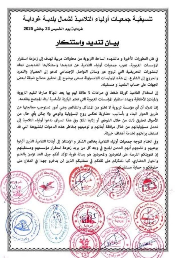 C’est dans ce contexte de « désobéissance juvénile » que treize (13) associations de parents d’élèves des dix (10) communes de la wilaya de Ghardaïa ont diffusés un communiqué commun (dont nous détenons une copie) à travers lequel elles dénoncent vigoureusement cette « ignoble tentative d’entrainer leurs enfants dans une aventure dangereuse dont ils seront les seuls perdants. Ils appellent ainsi tous les parents d’élèves à s’impliquer dans la retenue de leurs enfants et affirment s’opposer à toutes les manipulations qui toucheraient à l’école Algérienne » ajoutant « avoir confiance en nos responsables pour déjouer cette ignoble tentative de mettre en péril toute une génération et de ramener le calme dans nos établissements scolaires. », est-il mentionné.