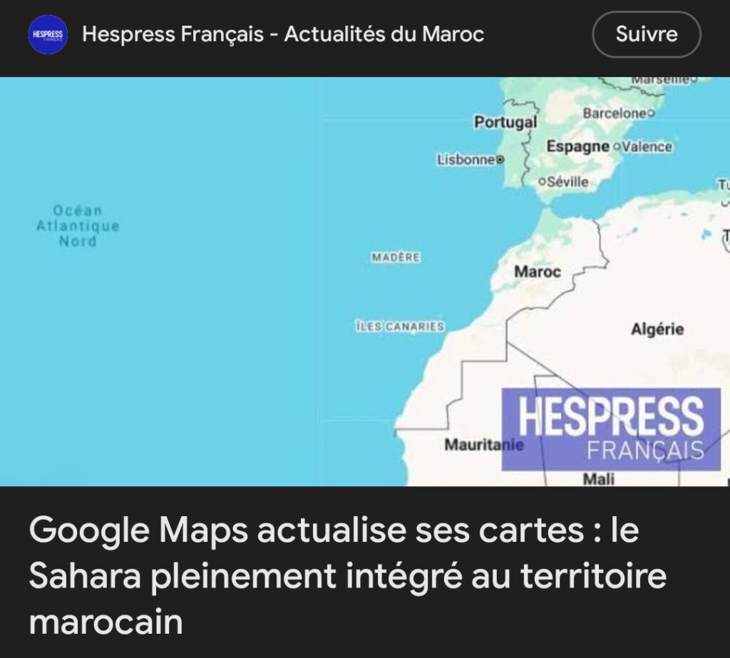 En effet, le service de géo-localisation du géant américain Alphabet ( Google ) est au cœur d’une fake news aussi grossière que ridicule. Et pour cause, ces médias Le Desk et Hespress en tête, des sites de « désinformation par excellence, n’ont pas trouvé mieux à inventer comme mensonge que d’attribuer à Google une « mise à jour » de la carte géographique du Sahara occidental « annexée » à l’intérieur du Royaume Chérifien.