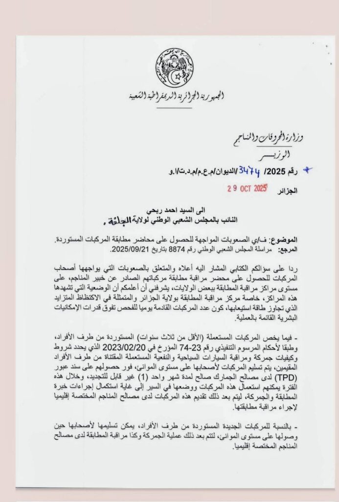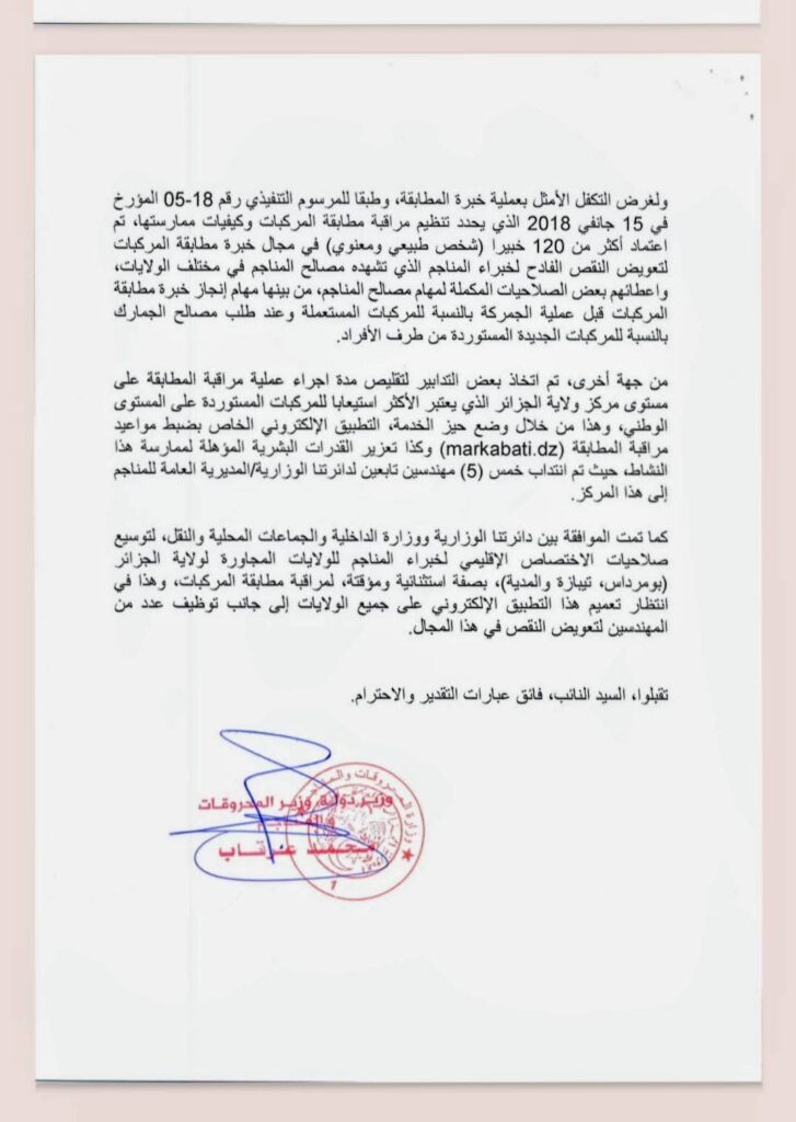 ● Plateforme numérique : Le ministre a rappelé le lancement de la plateforme « markabati.dz » qui offre la possibilité de prendre un rendez-vous en ligne, un outil essentiel pour une meilleure gestion des flux.