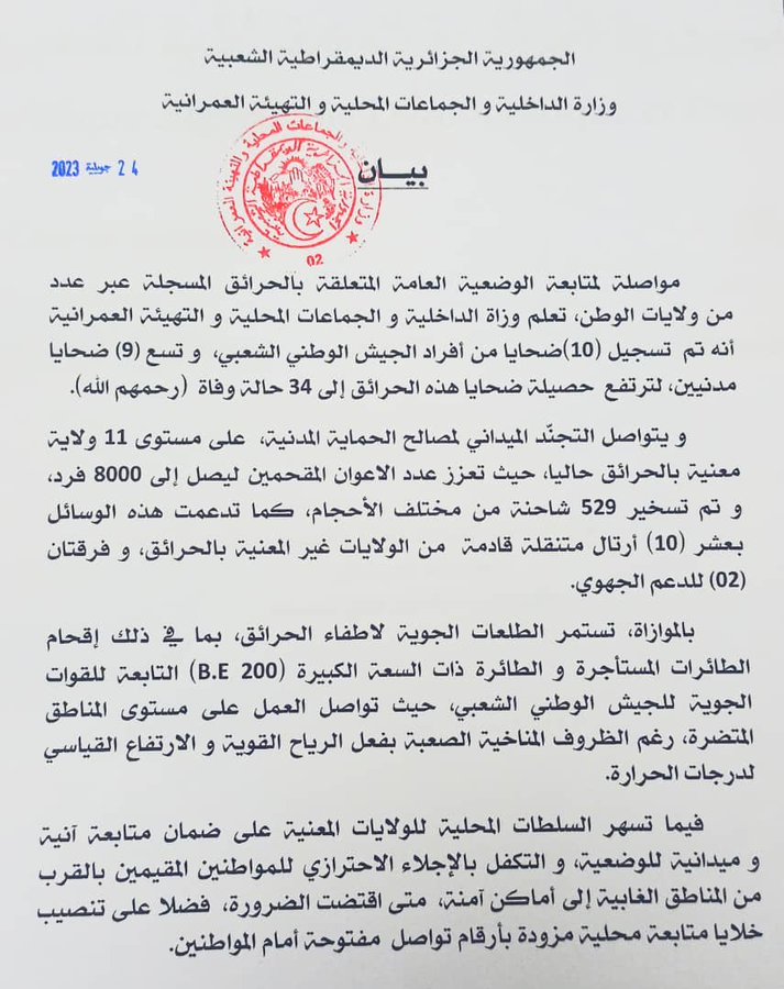 Le ministère de l’Intérieur souligne que les interventions se poursuivent actuellement au niveau de 11 wilayas : « Le nombre d’intervenants est passé à 8000 agents en plus de 529 camions, 10 colonnes mobiles et 02 colonnes régionales » explique le communiqué.