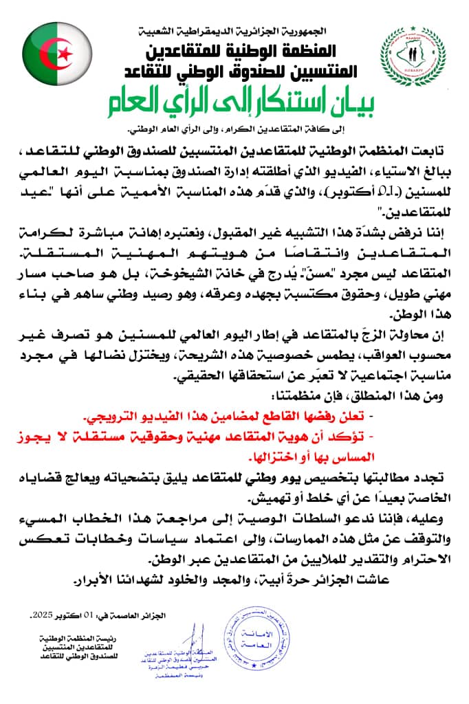En effet, ladite organisation dénonce de la plus vive des manières ce qu’elle qualifie d’une « offense directe » à l’égard des retraités algériens. «Nous condamnons fermement cette comparaison injustifiée et la considérons comme une atteinte directe à la dignité des retraités et une violation de leur statut professionnel indépendant», estime l’ONR.