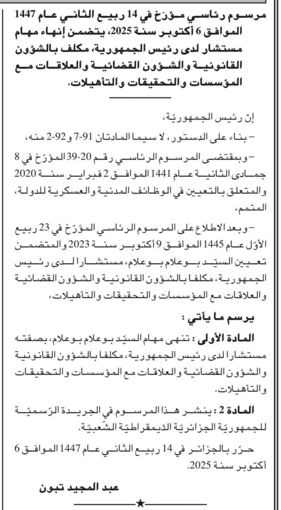 Ainsi et selon un décret présidentiel publié ce mardi 21 octobre 2025 au Journal officiel, plus précisément le décret n°68 daté du 14 octobre 2025, le chef de l’État a mis fin aux fonctions de M. Boualem Boualem en sa qualité de « conseiller » du président de la République.