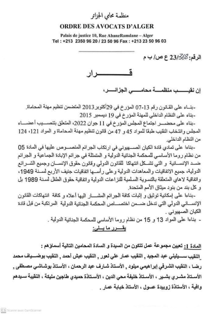 Dans ce sens et prenant à temoin l’opinion publique nationale et internationale, l’Union nationale des ordres des avocats d’Algérie ( UNOA), vient de constituer un un collège des plus brillants avocats algériens, afin poursuivre l’entité sioniste devant les juridictions internationales, notamment la Cour pénale internationale(CPI).