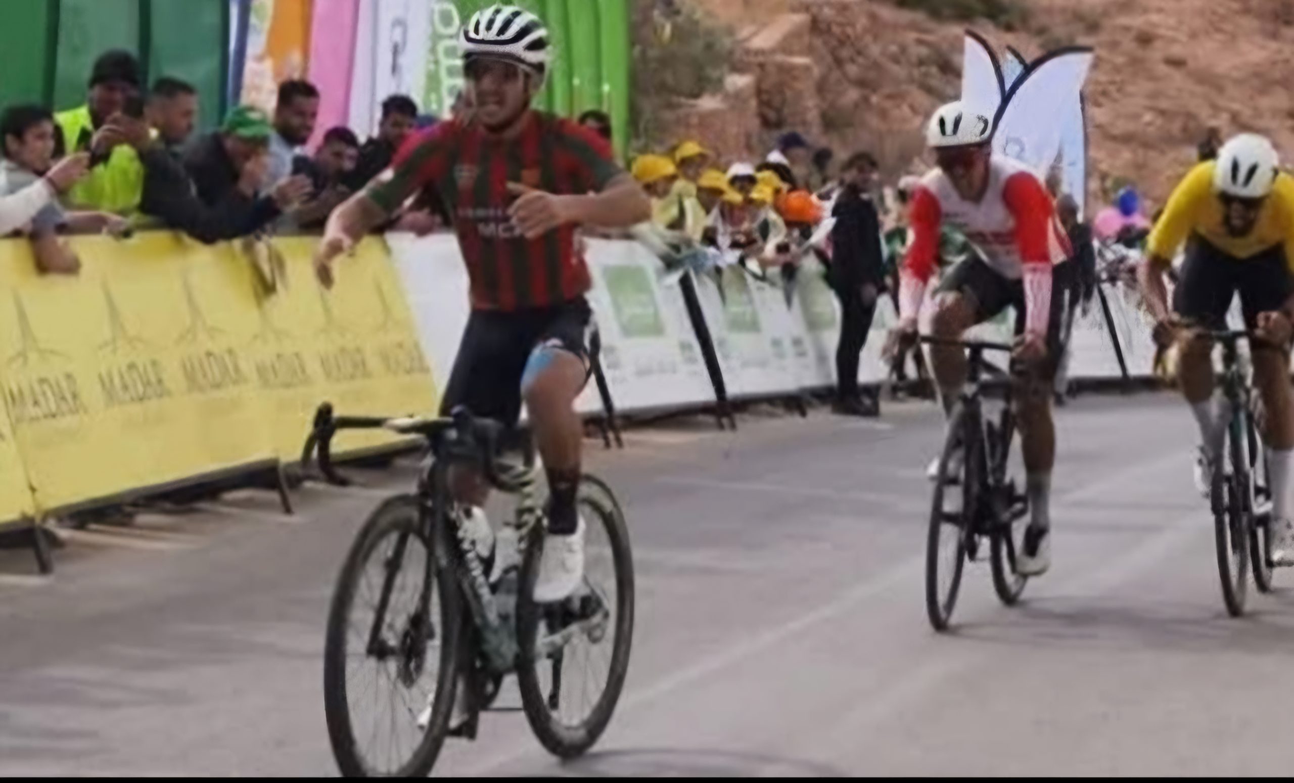 En effet, c’est le jeune coureur du Mouloudia d’Alger Mohamed Nadjim Assal qui a, en premier, franchi la ligne d’arrivée avec un chrono de 3 heures 52 minutes et 10 secondes suivi dans un même chrono de son coéquipier du Mouloudia d’Alger et porteur du Maillot jaune , Hamza Yacine et du coureur Algérien Hamza Amari, de l’équipe Madar Pro.