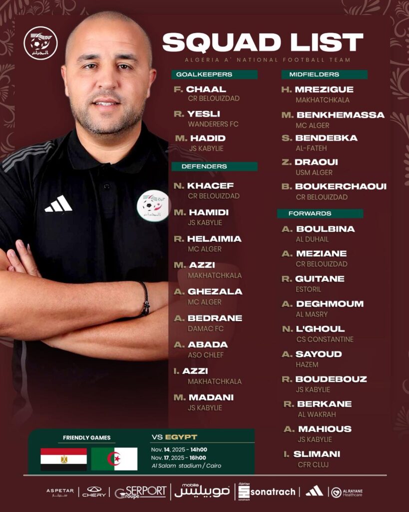 Madjid Bougherra a tranché. Le sélectionneur de l’équipe d’Algérie A’ a dévoilé une liste de 27 joueurs pour le stage de novembre, marqué par deux matchs amicaux face à l’Égypte au Caire (14 et 17 novembre).
