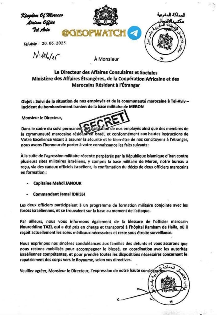 En effet, la mascarade de la « normalisation » est tombée : Rabat n’est plus un simple allié discret de Tel Aviv. Il envoie ses soldats mourir pour la cause sioniste. La preuve ? Une correspondance officielle, datée du 20 juin 2025, émanant du bureau de liaison marocain à Tel Aviv, révèle qu’au moins deux officiers marocains – le Capitaine Mehdi Janour et le Commandant Jamal Idrissi – ont été tués lors de la riposte iranienne sur la base militaire israélienne de Meron. Un troisième officier, Noureddine Tazi, a été grièvement blessé et hospitalisé à Haïfa.