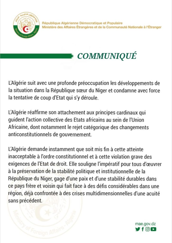 De son coté, l’Algérie condamne la tentative de coup d’Etat au Niger et exige que soit mis fin à cette « atteinte inacceptable » à l’ordre constitutionnel et à cette violation grave des exigences de l’Etat de droit.
