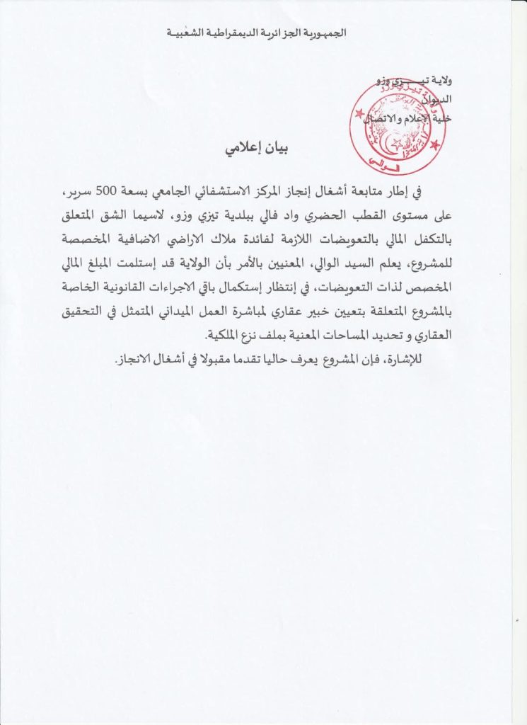 Les autorités de wilaya considèrent que cet engagement de l’ État est une preuve que ce projet va avancer sans entraves. Le communiqué à conclu que les travaux avancent comme il se doit.