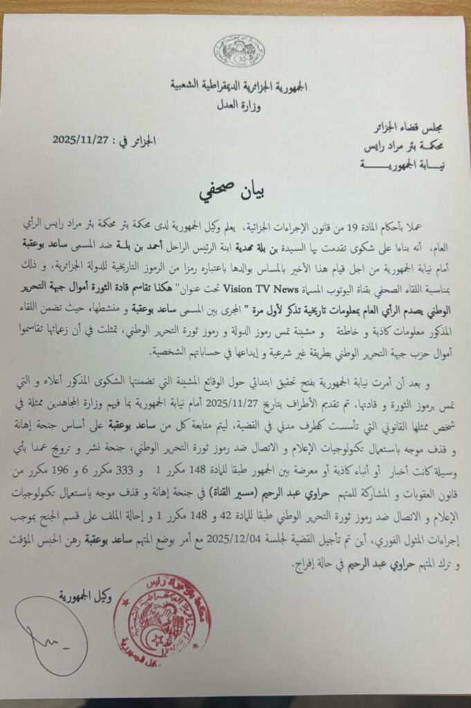 Dans le document du Parquet, il est indiqué que «suite à l’ouverture d’une enquête préliminaire par le Parquet concernant les propos diffamatoires contenus dans la plainte , et relatifs aux symboles de la révolution et à ses dirigeants, les parties ont déposé une plainte le 27 janvier 2025 auprès du Parquet, conformément aux dispositions légales du Ministère des Moudjahidines», est-il précisé.