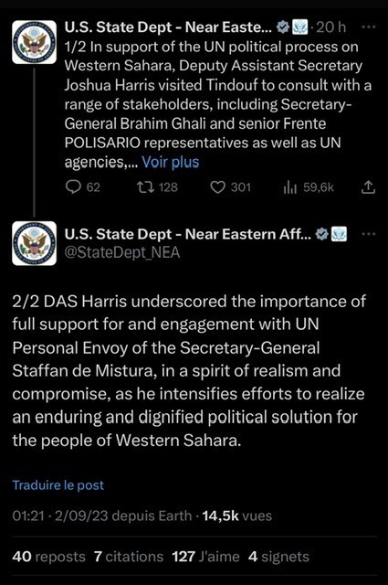 Sur la plate-forme X ( ex-tweeter), la Section des Affaires du Moyen-Orient du Département d’État a commenté ce samedi soir la visite du Sous-secrétaire adjoint Joshua Harris aux camps des réfugiés sahraouis de Tindouf « Le Sous-secrétaire adjoint Harris a souligné l’importance d’un soutien total et d’une collaboration avec l’Envoyé personnel du Secrétaire général des Nations Unies, Staffan de Mistura, dans un esprit de réalisme et de compromis, alors qu’il intensifie ses efforts pour réaliser une solution politique durable et digne pour le peuple du Sahara occidental », est-il indiqué.