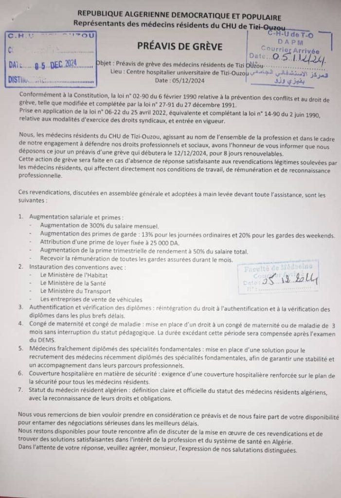 Pour ce qui est de l’authentification et vérification des diplômes, ils demandent la réintégration de ce droit, tout en demandant, la mise en place d’un droit à un congé de maternité ou maladie de trois mois sans interruption du statut pédagogique, mise en place d’une solution pour les médecins fraichement diplômés, la couverture hospitalière en matière de sécurité et, en dernier, de définir clairement et officiellement le statut des médecins résidents algériens. En dernier, les résidents ont exprimé leur disponibilité pour « entamer les négociations » afin de trouver des solutions satisfaisantes dans l’intérêt de la profession et du système de santé en Algérie ».