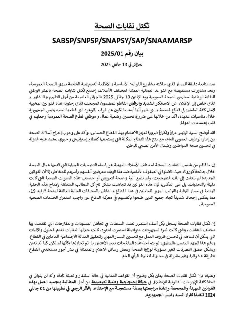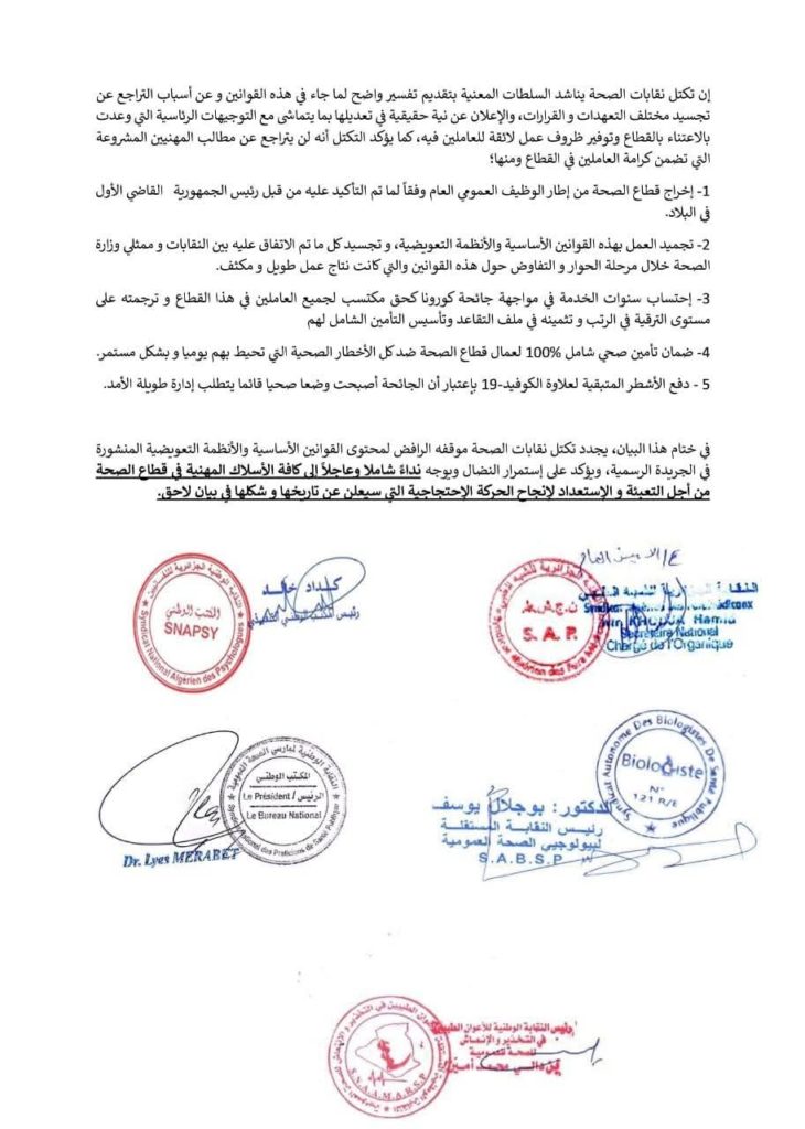 Enfin, les rédacteurs de ce long communiqué, ont énuméré leurs « exigences », lesquels s’articulent autour de cinq axes : En premier lieu, ils exigent que le secteur de la santé publique ne fasse plus partie de la nomenclature de la Fonction publique, et ce, disent-ils, conformément aux directives du président de la République. La deuxième revendication, consiste en le « gel » de la mise en œuvre de ces statuts, ainsi que leur système compensation, et aussi concrétiser ce qui a été convenu entre les syndicats et les représentants du ministère de la Santé lors de la phase de dialogue et de négociation concernant ces lois. Ensuite, cette Alliance syndicale revendique le fait que les années de service dans la lutte contre la pandémie du Covid-19, soient comptabilisées comme un « droit acquis » pour tous les travailleurs de ce secteur, et qu’elles servent de « faire-valoir » dans les promotions dans les grades et sa valorisation dans le dossier de retraite et la mise en place d’une assurance globale. Quatrièmement, ils revendiquent la mise en place d’une assurance maladie à hauteur de 100% pour l’ensemble des travailleurs du secteur de la santé et enfin, le versement des tranches restantes de la prime Covid-19, considérant cette dernière comme une »situation sanitaire permanente », laquelle nécessite une gestion à long terme.