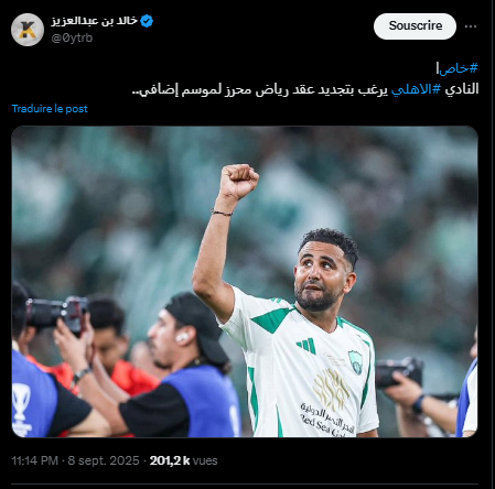 Porté par ses prestations étincelantes, Riyad Mahrez pourrait se voir offrir une prolongation de contrat. D’après la presse saoudienne, notamment le journaliste Khaled Ben Abdelaziz, la direction d’Al Ahli envisagerait d’étendre l’aventure de son numéro 7 d’une année supplémentaire. Ce projet de prolongation aurait pour but de récompenser l’Algérien pour ses services rendus et son rôle majeur dans la conquête historique du titre asiatique.