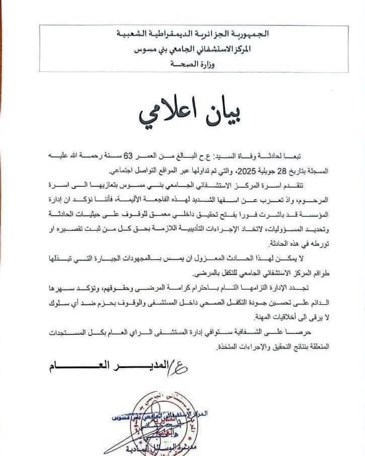 À la suite du décès d’un patient de 63 ans, survenu le 28 juillet 2025 et largement relayé sur les réseaux sociaux, la direction du Centre Hospitalo-universitaire (CHU) de Beni Messous présente ses condoléances et annonce l’ouverture d’une enquête approfondie pour faire toute la lumière sur cette affaire.