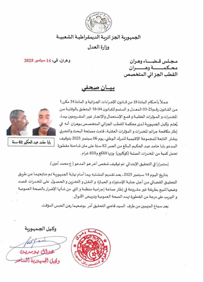 Ainsi, il s’agit du dénommé Baha Hamed Abdelhakim, âgé de 62 ans, arrêté le 6 septembre 2025. Lors de cette opération, les services compétents ont saisi une importante quantité de drogue dure estimée à 69 kilogrammes et 850 grammes de cocaïne destinée à commercialisation, et ce, en provenance de la wilaya de Béchar en direction vers le nord du pays.