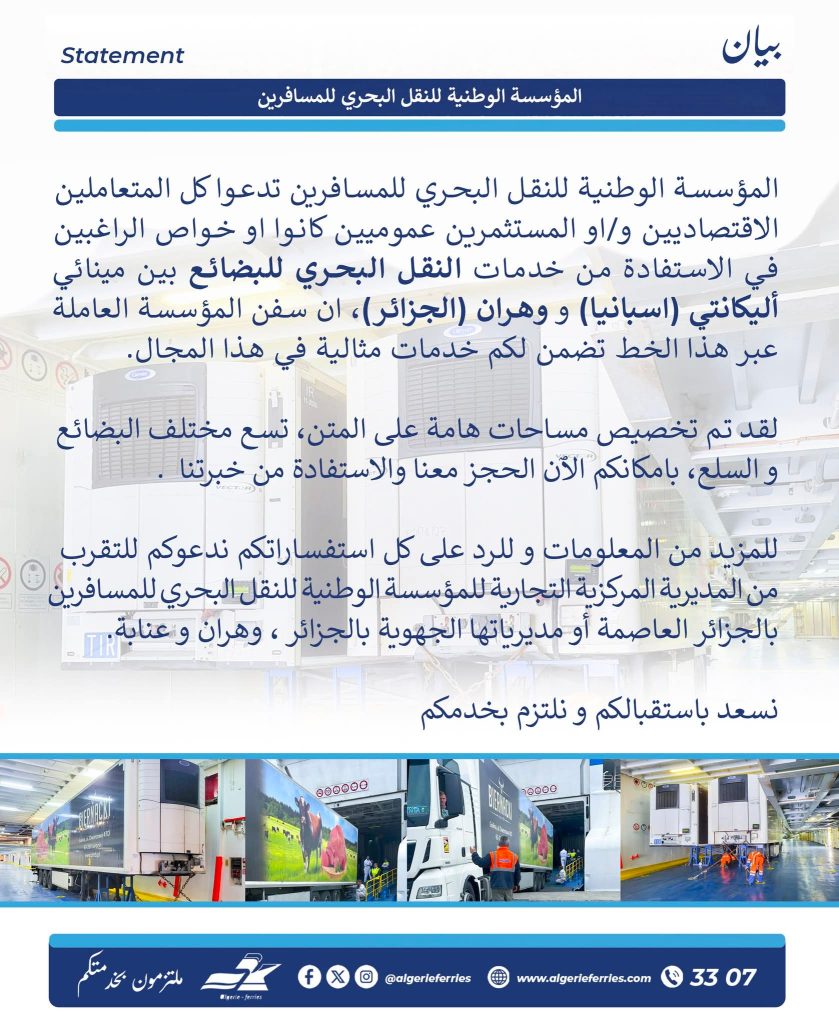 En effet et dans un communiqué rendu public ce lundi 21 juillet 2025, l’Entreprise nationale du transport maritime des voyageurs (ENTMV), plus communément appelée Algérie Ferries, a annoncé la mise en place de ce nouveau système se fret.