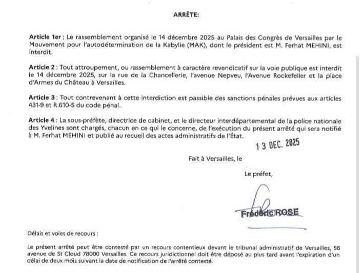 En effet, à travers cette interdiction, la France officielle vient d’infliger une véritable gifle aux séparatistes du MAK et à leur supposé et autoproclamé « président », le sinistre traître Ferhat Mhenni. Cet arrêté, annoncé le 13 décembre 2025, s’étend du samedi 18h00 au lundi 15 décembre 2025 à 08h00 et vise à prévenir des troubles à l’ordre public lors de cet événement organisé par le Mouvement pour l’autodétermination de la Kabylie (MAK).