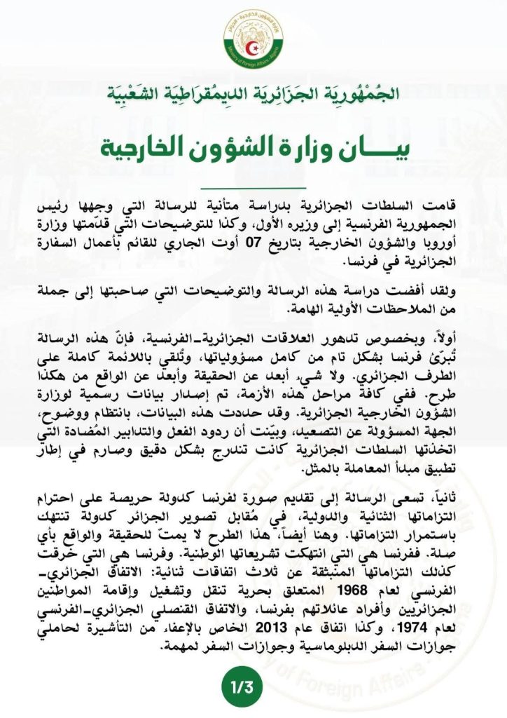 Ainsi, dans un long communiqué diffusé dans l’après-midi de ce jeudi 7 août 2025, soit au lendemain de la sortie extrêmement hostile du président Macron contre l’Algérie, que le ministère des Affaires étrangères, a répondu à la fois avec une fermenté jamais atteinte lors de cette crise, mais aussi avec une certaine sagesse et « pédagogie » où le département d’Ahmed Attaf, a clarifié point par point, les errances du locataire du Palais de l’Élysée.