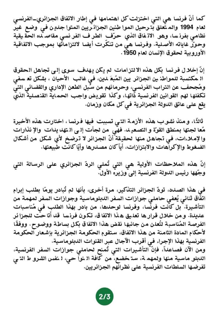 « L’ensemble de ces manquements français n’ont eu pour but que de passer outre le respect des droits acquis des ressortissants algériens éloignés souvent arbitrairement et abusivement du territoire français, leur privation des possibilités de recours administratifs et judiciaires que leur garantit pourtant la législation française elle-même et de vider de tout contenu le devoir de protection consulaire de l’Etat algérien à l’égard de ses ressortissants en tous lieux et en tout temps», souligne le MAE algérien.