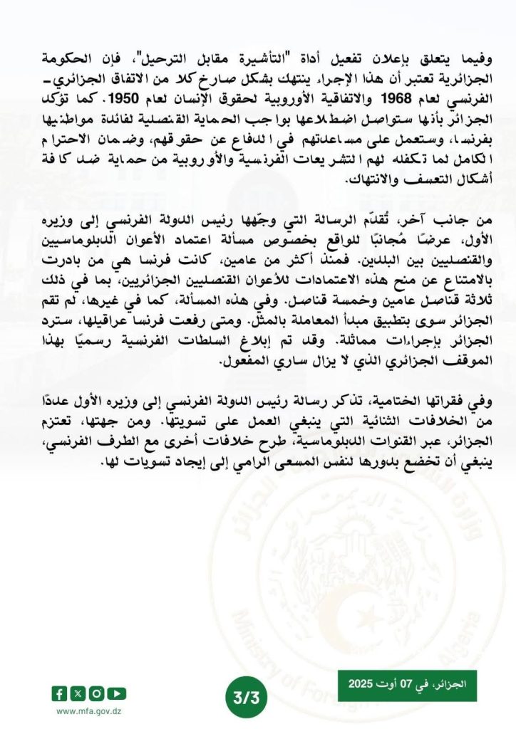 Concernant la réactivation du « levier visa-réadmission » par la France, l’Algérie dénonce une « violation flagrante » de l’accord de 1968 et de la convention européenne des droits de l’homme. Elle promet une « protection consulaire sans faille » pour ses ressortissants en France.